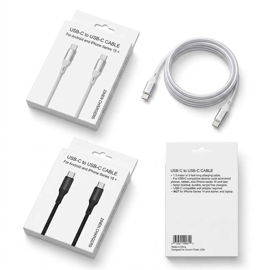 ZINEN USB Type-C to USB Type-C Cable – 2 Colors (Black and White) – Designed for Android & iPhone 15 and Later